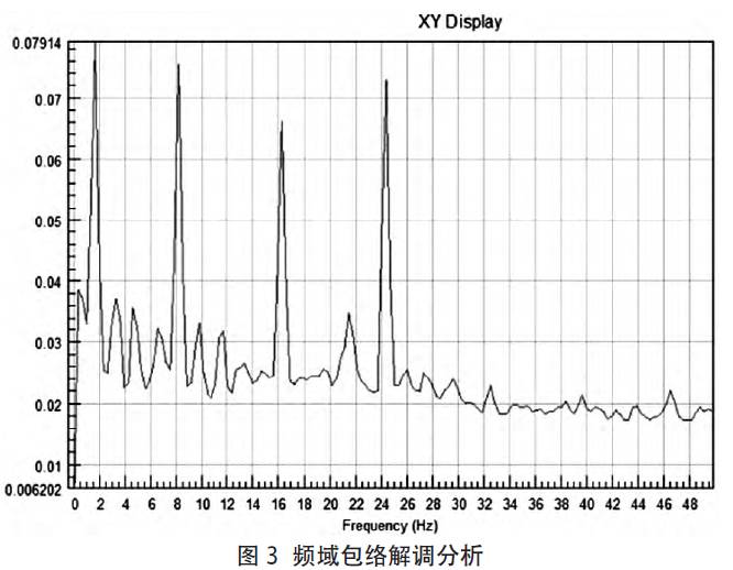 周期性脈沖力隨著(zhù)轉軸轉動(dòng), 其能量值在傳感器測點(diǎn)方向周期變化,產(chǎn)生振動(dòng)信號的調制現象,在頻譜上表現為在特征頻率或固有頻率兩側出現均勻的調制邊頻帶, 通過(guò)解調包絡(luò )分析能準確分析出邊帶成分,并與旋轉頻率比對,能判斷故障部件所關(guān)聯(lián)的轉軸。