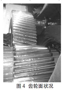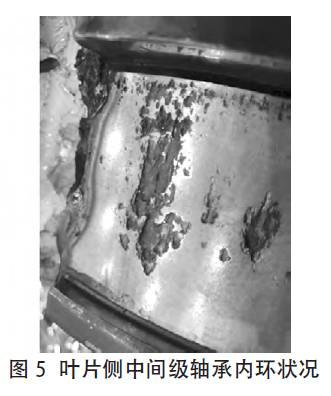 齒輪檢查,齒輪齒面有輕微壓痕,但總體狀況良好,無(wú)點(diǎn)蝕、齒根扯斷現象;拆卸葉片側中間級軸承后,發(fā)現其軸承內環(huán)嚴重剝落,與測試分析結果一致。更換該軸承后,齒輪箱振動(dòng)、噪聲正常,故障消除。