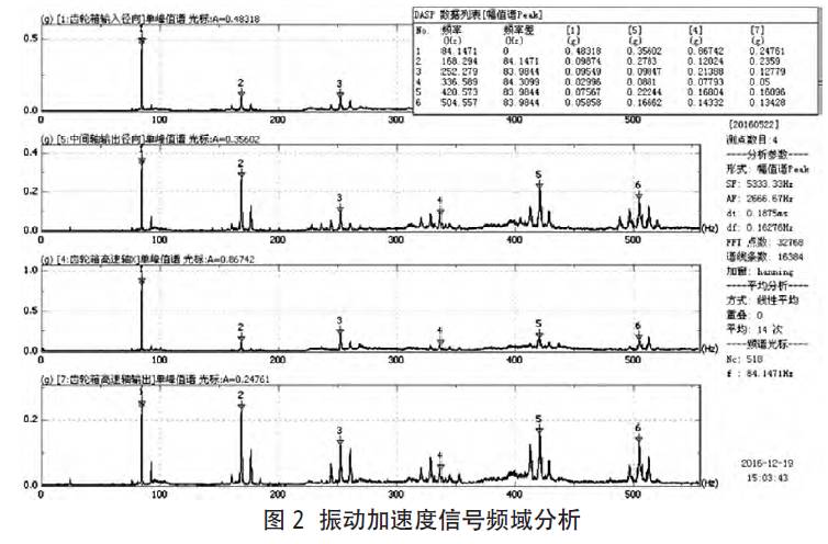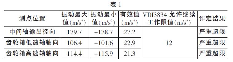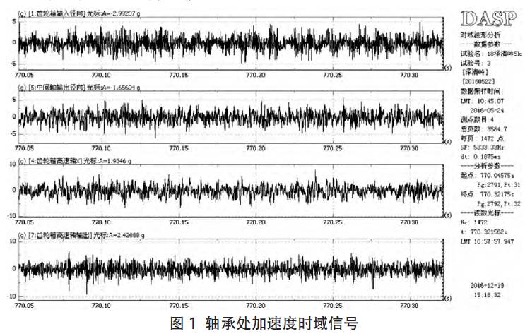 某風(fēng)力發(fā)電機組傳動(dòng)鏈整體振動(dòng)大,并伴隨巨大轟鳴聲,在幾百米外能聽(tīng)到該機艙發(fā)出連續、巨大聲響。發(fā)電機振動(dòng)遠小于齒輪箱,且將齒輪箱與發(fā)電機之間聯(lián)軸器拆掉,發(fā)電機不運轉,發(fā)現高頻大幅振動(dòng)依然存在,判定振動(dòng)為齒輪箱引起;依據當前風(fēng)力發(fā)電設備的故障現象和現場(chǎng)工作狀況,齒輪箱較容易產(chǎn)生故障的部位為齒輪以及齒輪箱的前后軸承,考慮到現場(chǎng)情況及測試的方便性, 我們在測試中選擇齒輪箱前后軸承作為測量重點(diǎn)[5]。