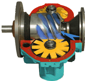 螺旋轉子凹槽經(jīng)過(guò)吸氣口時(shí)充滿(mǎn)氣體。當轉子旋轉時(shí),轉子凹槽被機殼壁封閉,形成壓縮腔室,當轉子凹槽封閉后,潤滑油被噴入壓縮腔室,起密封。冷卻和潤滑作用。當轉子旋轉壓縮潤滑劑+氣體(簡(jiǎn)稱(chēng)油氣混合物)時(shí),壓縮腔室容積減小,向排氣口壓縮油氣混合物。當壓縮腔室經(jīng)過(guò)排氣口時(shí),油氣混合物從壓縮機排出,完成一個(gè)吸氣--壓縮--排氣過(guò)程。